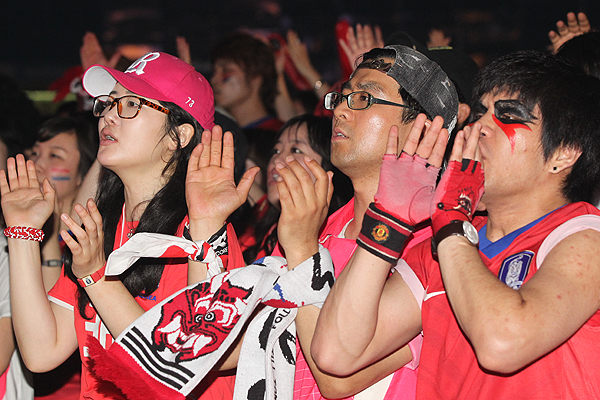 2010 남아공 월드컵 대한민국-아르헨티나 경기가 열린 17일 서울광장에서 거리응원을 하던 붉은악마 응원단이 경기가 1-4로 패하자 대표팀에게 용기를 불어 넣는 응원을 하고 있다.