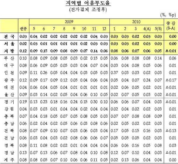 서울지역은 올해 들어 3월 한달은 제외하고 매월 0.03%의 어음부도율을 유지하고 있다.