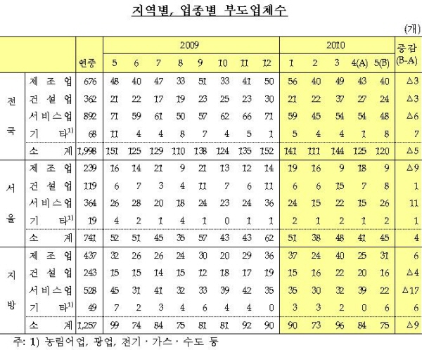 전국 부도 업체수 120개..전월대비 5개 감소