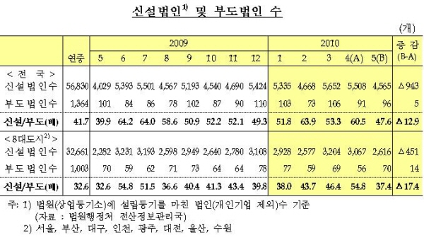 또 신설법인수는 4565개로 전월(5508개)보다 943개 감소했다. 부도법인수에 대한 신설법인수의 배율도 전월(60.5배)보다 낮은 47.6배를 기록했으나 전년 동월 대비 배율은 39.9배를 기록해 증가세를 나타냈다.