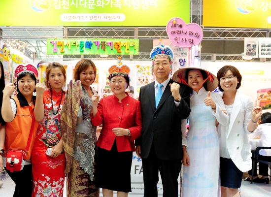 21일 포스코센터에서 열린 '일곱빛깔 다문화 DAY' 행사에 참석한 정준양 포스코 회장(오른쪽 세번째)과 백희영 여성가족부 장관(오른쪽 네번째)이 몽골 전통 모자를 쓰고 참석자들과 포즈를 취하고 있다.