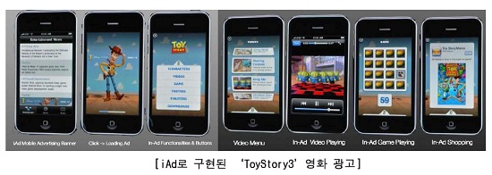 앱(App) 이용 중 하단 배너 클릭으로 iAd 구동(iAd 종료시 이전화면 복귀)되는 방식을 적용했다. iAd로 제작된 개봉예정작 ‘토이스토리 3’는 캐릭터 설명, 예고편 시청, 게임, 영화포스터 보기, 영화표예매, 각종 상품을 판매하는 등 다양한 정보를 볼 수 있다.