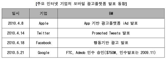 22일 업계에 따르면 애플, 트위터, 페이스북, 구글이 모바일 광고 BM(Bussiness Model) 전략을 수립하는 등 시장 선점을 위해 발빠른 행보를 보이고 있다.