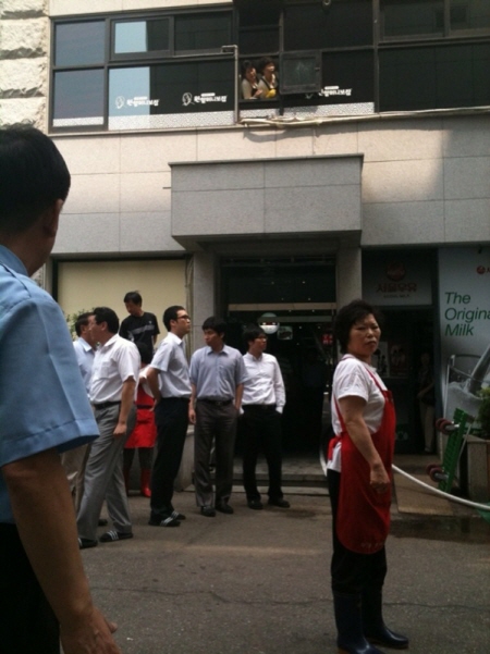 ▲여의도 일대에서 일어난 화재로 주변상가의 시민들이 걱정되는 눈빛으로 바라보고 있다. (사진=김소희 기자)