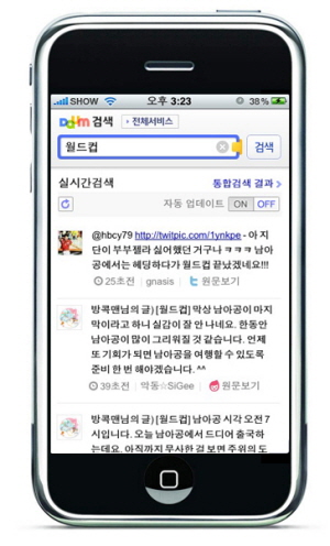 다음커뮤니케이션이 카페나 블로그, 뉴스는 물론 마이크로 블로그인 트위터나 요즘의 데이터까지 초단위로 찾아주는 ‘실시간 검색’ 서비스를 모바일웹에도 적용했다고 22일 밝혔다.