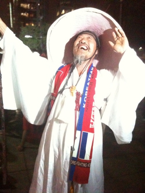 남아공월드컵 대한민국과 나이지리아와의 예선 마지막 경기가 예정된 가운데 22일 저녁 코엑스에서 '김삿갓' 복장을 한 시민이 응원을 하며 포즈를 취하고 있다.