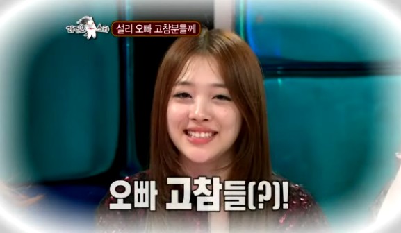 이에 MC들이 "오빠가 한창 힘들 시기다"며 "군대에 있는 오빠의 고참들에게 영상 편지를 보내라"고 요구하자 설리는 "오빠 고참들 안녕하세요"라며 깜찍한 인사를 전했다.