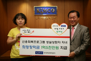 한국자산관리공사는 24일 서울 삼성동 공사 본관에서 신용회복지원 프로그램인 '한마음 금융'과 '희망모아'의 성실채무상환 고객자녀에게 '희망장학금' 1억5000만원을 전달했다. 신용회복지원본부 강연욱이사(오른쪽)는 고객 자녀 300명에게 장학금을 지급했다.