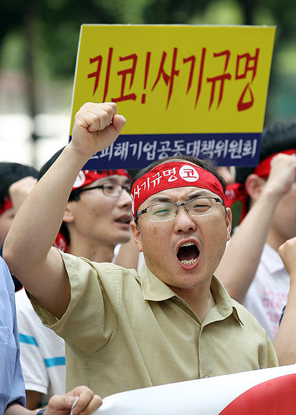 키코(KIKO)피해업체공동대책위원회 회원 250여명은 24일 오전 서울 여의도 금융감독원앞에서 기자회견을 갖고 기업에 불리한 키코상품을 제대로 감독하지 못한 금융감독원의 책임을 묻는 집회를 벌이고 있다.