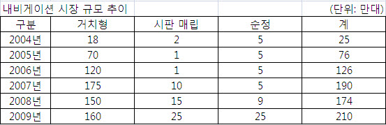 국내 내비게이션 시장 구도를 변화시키고 있는 '비포어 마켓' 내비게이션은 2008년 약 9만대에서 지난해 300%에 가까운 성장세를 보였다.