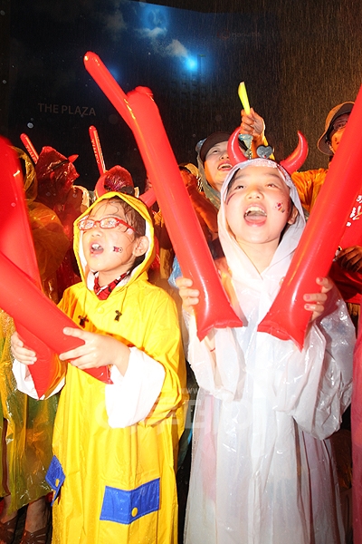 2010 남아공 월드컵 16강전 대한민국-우루과이 경기를 앞둔 26일 서울광장에 거리응원을 나온 어린이들이 빗속에서 대표팀을 응원하고 있다.