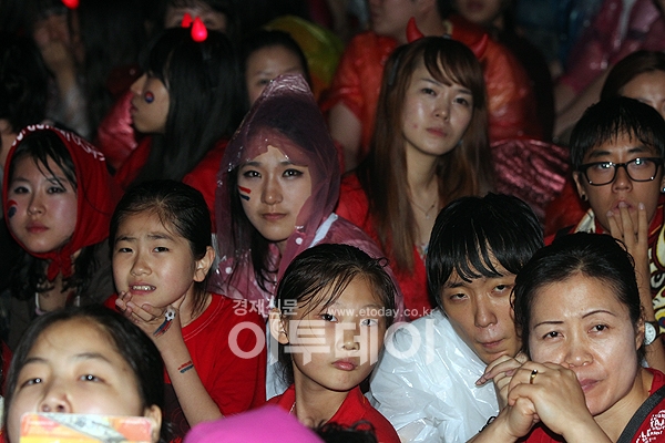 2010 남아공 월드컵 16강전 대한민국-우루과이 경기가 진행중인 27일 후반 우루과이에 추가골을 허용하자 서울광장에서 거리응원을 하던 시민들이 안타까워하고 있다.