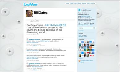빌 게이츠 MS 전 회장의 트위터는 시작 5시간만에 6만여명의 팔로어를 끌어모으고 현재 팔로어가 100만명을 넘는 등 폭발적인 인기를 누리고 있다.