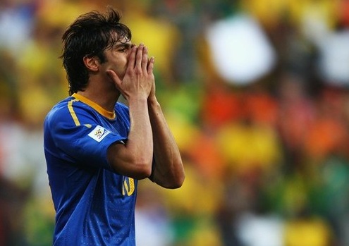 브라질의 카카가 네덜란드와의 남아프리카공화국 월드컵 8강전에서 아쉬운 표정을 짓고 있다. 브라질은 2일 오후(한국시간) 포트 엘리자베스에 위치한 넬슨 만델라 베이 경기장에서 네덜란드를 맞아 1-2로 아쉽게 석패했다. 전반 10분 호비뉴가 선취 득점을 했지만 후반전 멜루의 자책골과 상대 스네이더의 역전 골로 무릎을 꿇었다. 이로써 브라질은 4년 뒤 자국에서 개최되는 월드컵에서 우승을 기약하게 됐다.