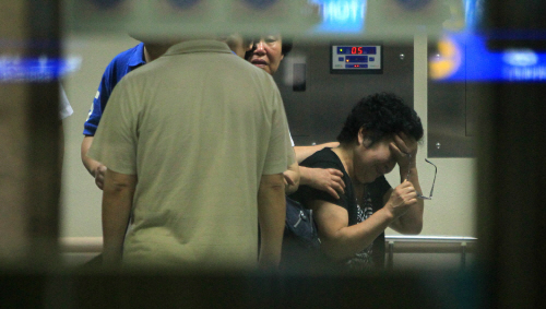 인천대교 연결도로 고속버스 추락사고 희생자 가족들이 3일 오후 부상자와 사망자들이 옮겨진 인천시 중구 인하대병원 응급실 입구에서 슬픔에 잠겨 있다.