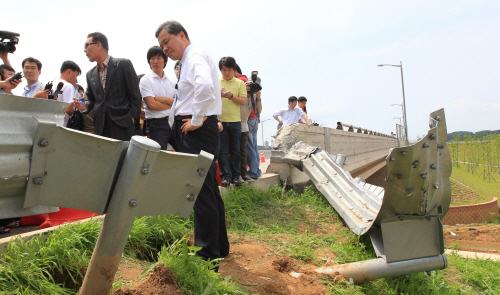 인천 버스추락사고 희생자 가족들이 4일 오후 현장검증이 실시되고 있는 인천시 중구 영종도 인천대교 연결도로 사고현장을 찾아 파손된 도로시설물 등을 살펴보고 있다.
