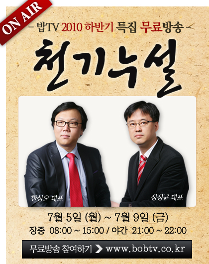 벌써 2010년 상반기가 마감이 되었지만 실질적으로 개인투자자들의 계좌는 손실로 시퍼렇게 멍들어 있을 것이 분명하다. 그래서 왜 밥TV를 이용하는 투자자들이 왕따라는 말까지 사용하였는지 확인시키고자 무료 특집방송을 준비했다.