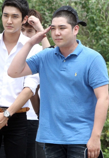 인기 아이돌그룹 슈퍼주니어의 멤버 강인이 5일 오후 충청남도 논산에 위치한 육군훈련소에 입대하며 경례를 하고 있다. 강인은 앞으로 5주간의 기초 군사훈련을 마친 뒤 현역으로 복무한다.