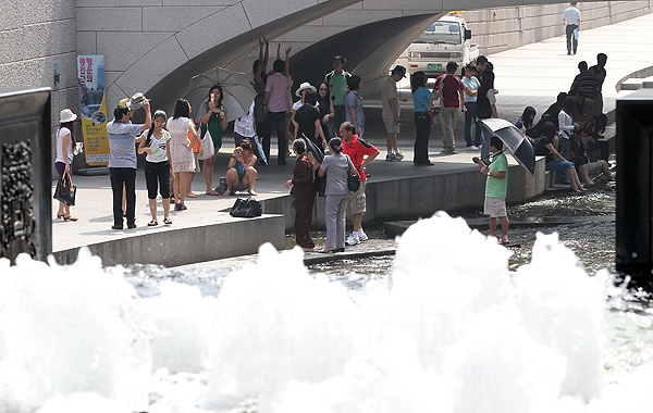 6일도 30도 안팎의 더위가 예상되는 가운데 오전 서울을 찾은 외국관광객이 청계천에서 더위를 식히고 있다.