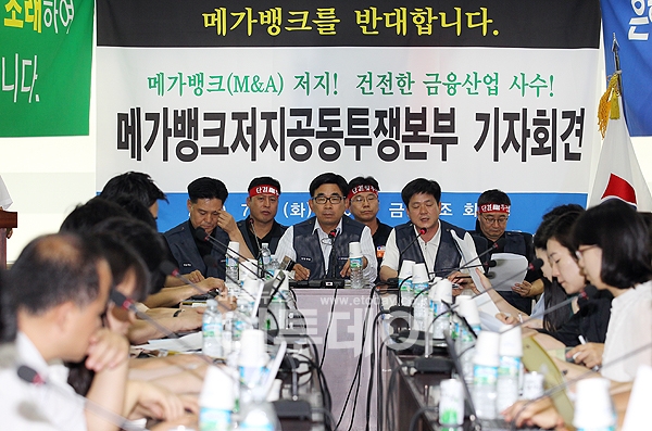양병민 전국금융산업노동조합 위원장 및 메가뱅크저지공동투쟁본부 조합원은 6일 오전 서울 중구 금융노동조합 사무실에서 기자회견을 갖고 우리금융과 KB금융간의 인수합병(메가뱅크)을 추진하는 어윤대 KB회장내정자 발언철회를 요구하고 있다.