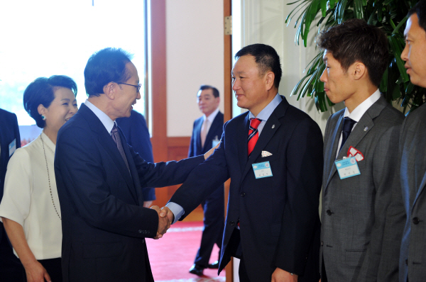 이명박 대통령이 6일 낮 청와대에서 열린 남아공 월드컵 축구대표팀 초청오찬에서 허정무 감독을 격려하고 있다.