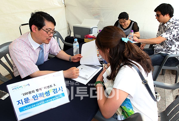 7일 오후 서울광장에서는 노동부 주최로 '사회적기업 3주년 기념행사' 가 열린 가운데, 참가자들이 취업적성검사 부스에서 상담을 받고 있다.