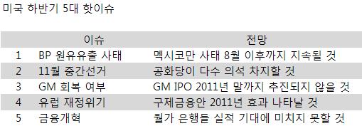 미국경제의 하반기 이슈는 무엇일까. 대외적으로 유럽 재정위기 사태라는 커다란 불확실성을 포함해 미국은 5가지 주요 이슈들에 직면하고 있다는 주장이 제기됐다. .