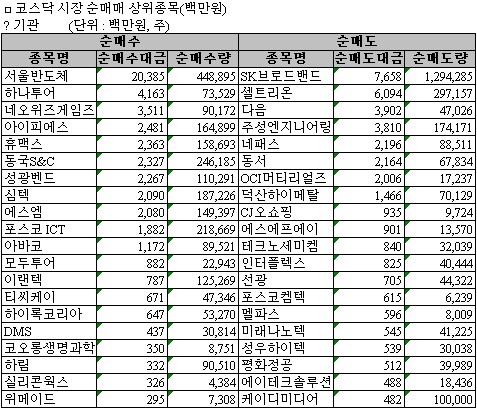 기관은 SK브로드밴드(76억원)와 셀트리온(60억원), 다음(39억원), 주성엔지니어링(38억원), 네패스·동서(21억원) 등을 팔았다. 기관은 SK브로드밴드가 52주 신고가를 기록한 6400원 부근에서 최근 사흘 연속 순매도 중이며 이날 매물을 대거 쏟아낸 탓에 SK브로드밴드는 7% 중반 급락했다.