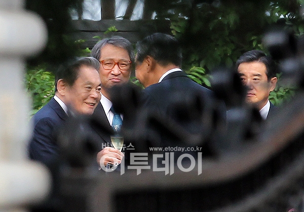 15일 오후 서울 한남동 승지원에서 삼성전자 이건희 회장과 전경련 회장단과의 만찬이 예정된 가운데, 이건희 삼성전자 회장과 이건산업 박영주 회장이 인사를 나누고 있다.