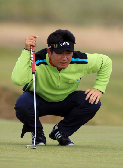 골퍼 양용은이 16일(한국시간) 스코틀랜드 세인트앤드루스 올드코스에서 열린 제139회 브리티시오픈 대회 1라운드 15번홀에서 퍼팅라인을 살피고 있다. 그는 이날 우즈와 공동 8위에 올라 우승권에 다가섰다.