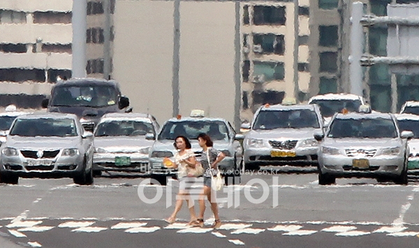 전국적으로 30도를 웃도는 폭염이 계속되고 있는 가운데 22일 오후 서울 시민들이 아스팔트 위로 아지랑이가 피어오르는 여의도공원 주변의 건널목을 건너고 있다.
