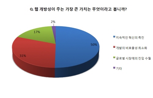 또 개발자들은 웹 개방성이 지속적인 혁신을 촉진한다고 봤다. 답변자 중 75%가 글로벌 표준에서 벗어나는 국내만의 고립된 표준(41%) 및 정부 차원의 각종 규제(34%)가 웹 개방성에 가장 큰 걸림돌이라고 응답했다.