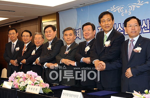 27일 오전 서울 소공동 롯데호텔에서 지식경제부 주최로 '지식경제 R&D 지원시스템 혁신을 위한 업무협약식' 이 열린 가운데 참석자들이 협약식을 마치고 포즈를 취하고 있다. 왼쪽부터 김태영 농협중앙회 신용대표이사, 이백순 신한은행장, 윤용로 중소기업은행장, 최경환 지식경제부장관, 이종휘 우리은행장, 서영주 한국산업기술평가관리원장, 김정태 하나은행장, 최기의 국민은행 이사부행장.
