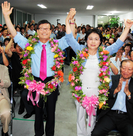 충북 충주 국회의원에 출마한 한나라당 윤진식 당선자와 부인 백경애 여사가 28일 오후 재선거에서 승리를 확정지은 뒤 연호하는 지지자들 앞에서 손을 들어 인사하고 있다.