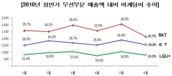 무선시장은 1분기에는 아이폰 출시 등에 따라 마케팅 경쟁이 과열되는 양상이었으나 마케팅비 가이드라인 시행에 따라 6월 마케팅비는 가이드라인에서 제시한 22% 보다 낮은 21.9%를 기록했다.