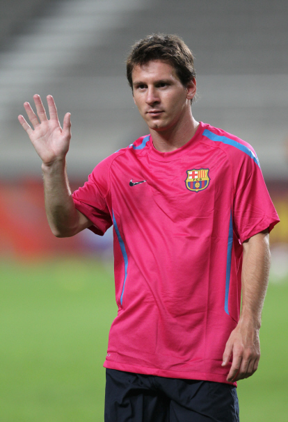 스페인 명문프로축구팀 FC 바르셀로나의 리오넬 메시(아르헨티나)가 3일 오후 서울 상암동 월드컵경기장에서 열린 공개훈련에서 관중들의 환호에 손을 흔들며 답례하고 있다. 바르셀로나는 다음날 K리그 올스타팀과 친선경기를 가질 예정이다.
