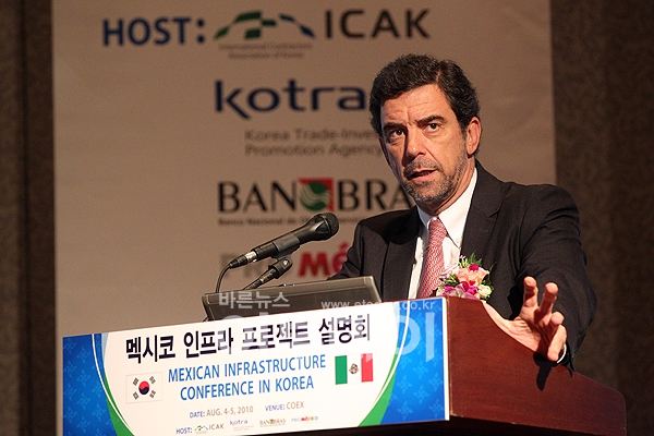 해외건설협회와 대한무역투자진흥공사(KOTRA)가 함께 진행하는 멕시코 인프라 프로젝트 설명회가 4일 삼성동 코엑스에서 개최된 가운데 Alonso Garcia Tames 멕시코 공공건설은행 총재가 국영금융기관의 역활에 대해 설명하고 있다.