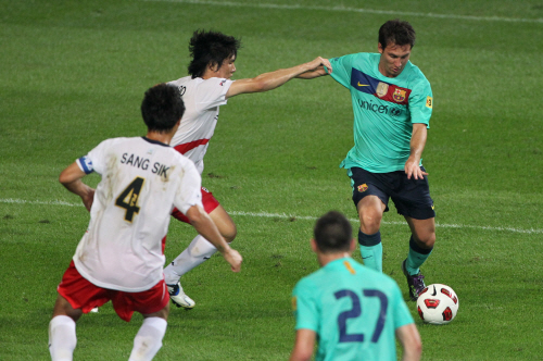 4일 오후 서울월드컵경기장에서 열린 FC바르셀로나와 K-리그 올스타의 친선경기에서 리오넬 메시(오른쪽)가 전반전에 교체투입돼 역전 골이자 자신의 두 번째 골을 터뜨리고 있다.