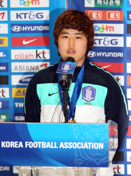 독일 U-20 여자월드컵에서 멋진 프리킥골을 넣으며 한국 대표팀을 3위로 이끈 김나래가 4일 오후 인천국제공항을 통해 입국한 뒤 취재진의 질문에 답하고 있다.