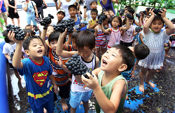 8월8일 포도데이를 앞두고 농협중앙회가 주최한 홍보이벤트가 열린 지난 5일, 청계광장에서 어린이들이 포도가 담긴 풀장에서 포도를 밟고 있다. 이날 행사에서는 지역별 대표 포도 및 품종 전시회, 국산 와인 전시 및 시음회 등이 열렸다.