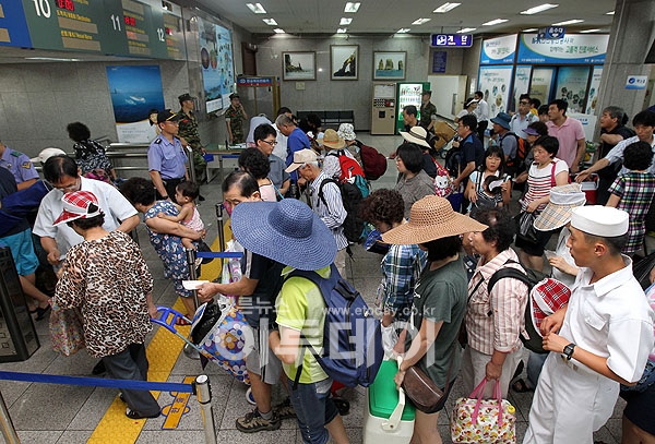 폭염이 연일 이어지고 있는 가운데, 휴가 절정인 6일 오전 인천연안여객터미널은 인천근해의 섬으로 휴가를 떠나려는 여행객들로 붐비고 있다.