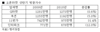 온라인몰 1세대인 인터파크의 경우 방문자수가 오픈마켓 가운데 가장 적은 것으로 집계됐다. 경쟁사 3사의 월 평균 방문객이 1000만명을 상회하는 반면 인퍼파크의 경우 700만명에 불과했다.