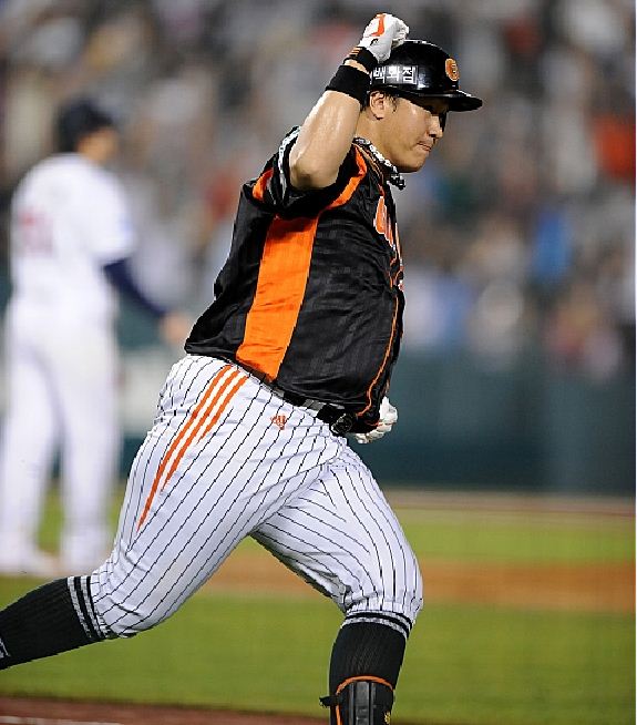5일 오후 잠실야구장에서 열린 2010 프로야구 두산 베어스와 롯데 자이언츠의 경기에서 4회초 롯데 공격, 1사 주자 2루 이대호가 2점홈런을 치고 기뻐하고 있다