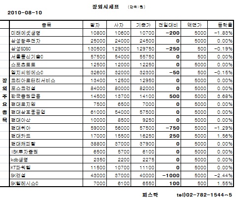 장외 주요 종목들은 10일 하락세 및 보합세를 보였다.