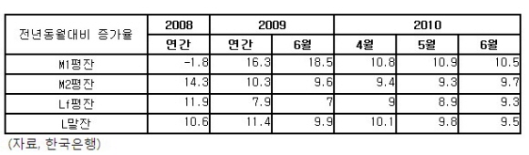 11일 한국은행이 발표한 '2010년 6월중 통화 및 유동성 동향'에 따르면 지난 6월 중 M1(평잔)은 지난해 같은 달과 비교해 증가율이 10.5%를 기록했다.