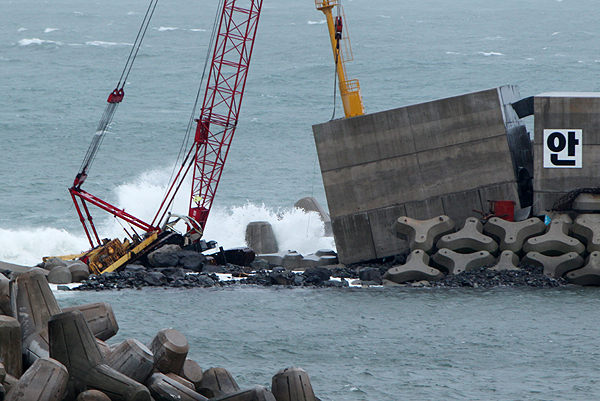 11일 제4호 태풍 뎬무가 제주를 강타하면서 건설공사가 한창이던 서귀포시 하효항의 방파제 100여m가 유실되고 크레인이 물에 잠기는 피해가 발생했다.
