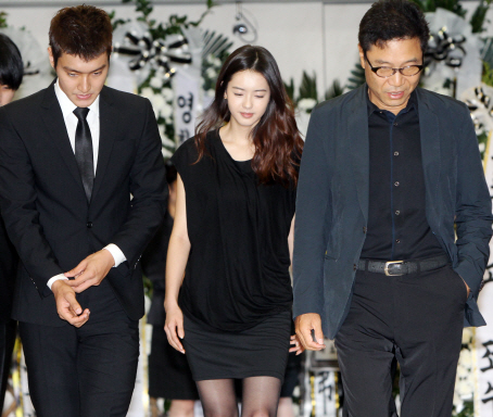 남성그룹 슈퍼주니어의 최시원과 배우 고아라, SM 엔터테인먼트 이수만 대표(왼쪽부터)가 13일 오후 서울 연건동에 위치한 서울대병원 장례식장에 마련된 패션디자이너 故 앙드레 김(본명 김봉남)의 빈소를 찾아 조문을 하고 있다.