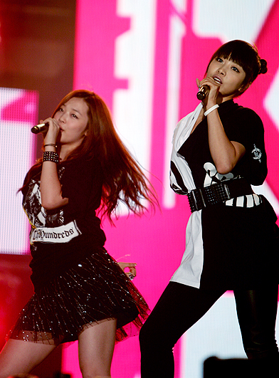 걸그룹 f(x)가 지난 12일 밤 강원 속초시 청초호특설무대에서 열린 MBC 음악프로 쇼!음악중심 녹화 방송에서 열창하고 있다. 이날 무대는 속초시가 주최한 2010 대한민국 음악대향연 축제 둘째 날 프로그램으로 진행됐고, 녹화방송은 14일 오후 4시20분 MBC에서 방영된다.