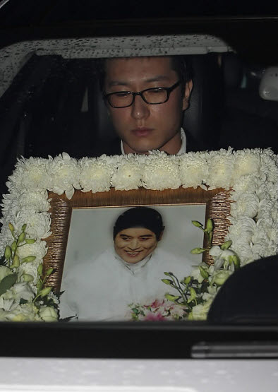 15일 오전 종로구 연건동 서울대병원 장례식장에서 열린 원로 패션디자이너 故 앙드레 김(본명 김봉남) 영결식에서 고인의 영정이 운구차로 이동하고 있다.