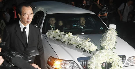 15일 오전 종로구 연건동 서울대병원 장례식장에서 열린 원로 패션디자이너 故 앙드레 김(본명 김봉남) 영결식에서 고인을 실은 운구차가 병원을 빠져나고 있다